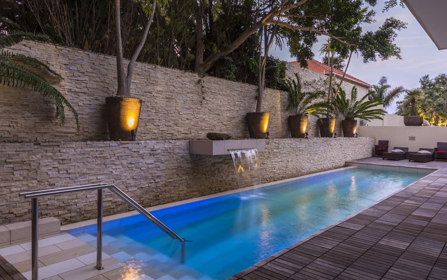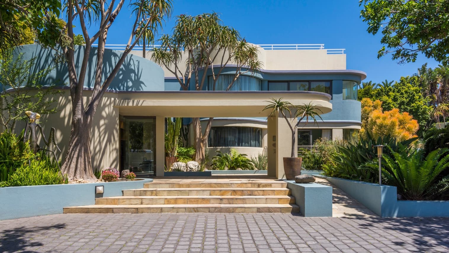 The garden, with a small swimming pool and sun-loungers, tranquilly creates the landscape of the Eastern Cape bushveld with rocks weighing up to four tons and planting of aloes, strelitzias, erythrina trees and cycads.