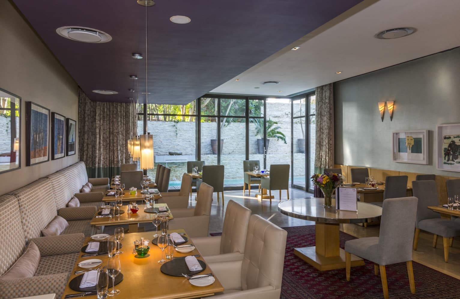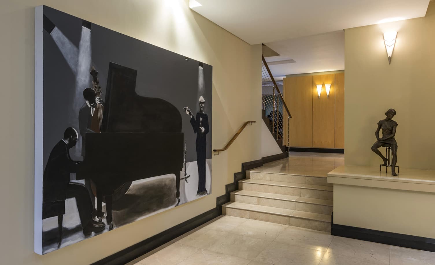 No5 is an immaculately restored boutique art-deco hotel in Port Elizabeth (Gqeberha), South Africa. Located less than ten minutes from Port Elizabeth Airport, No5 is nestled in the affluent Summerstrand suburb, away from the hustle and bustle, yet an easy stroll to the ocean which is less than one hundred yards away. No5 is filled with gems – a privately-owned art collection and world-class facilities all hand-selected for the enjoyment of both business and leisure travelers. Setting the precedent in Port Elizabeth for luxury accommodation and service, No5 is a showcase of authentic South African art and a masterpiece of comfort and opulence. The ten suites are complemented by a fine dining restaurant and private dining cellar, whiskey and cigar lounge, private cinema, and TITE Medi Spa by Camelot. Walking into the 30-seater Jazz Room is like walking into New York City’s Harlem in the 1920s. A piano tinkles, bass thrums, a trombone sings, and drums improvise the percussive rhythm as the soundtrack evokes the Jazz Age. As with every room at No. 5, this restaurant is an art gallery. One wall pays tribute to the musicians of that racy era of jazz …..