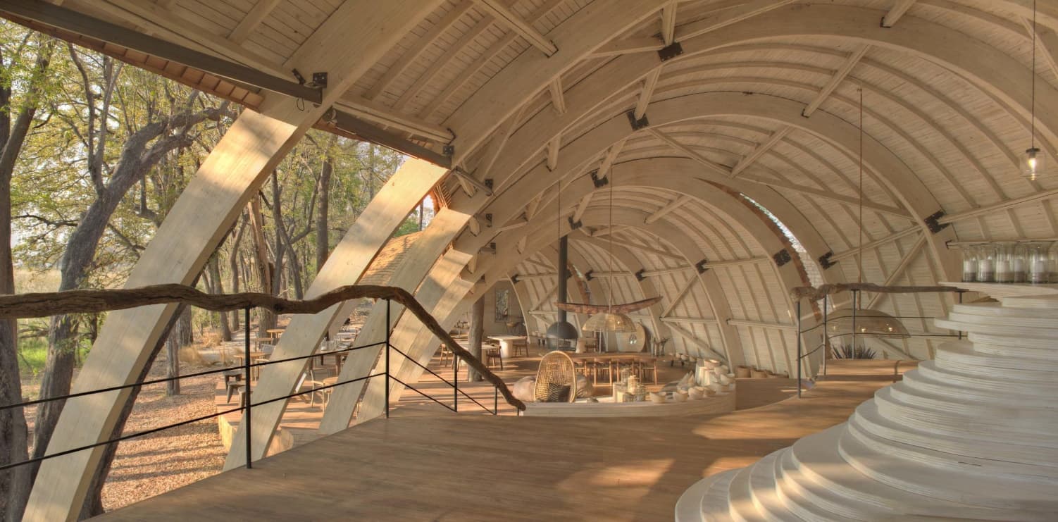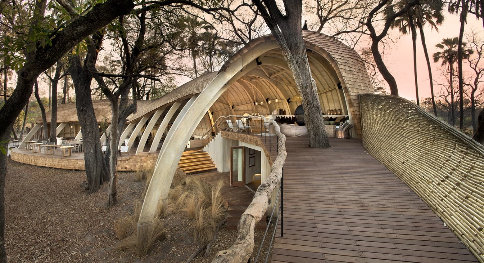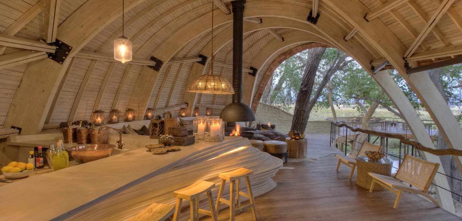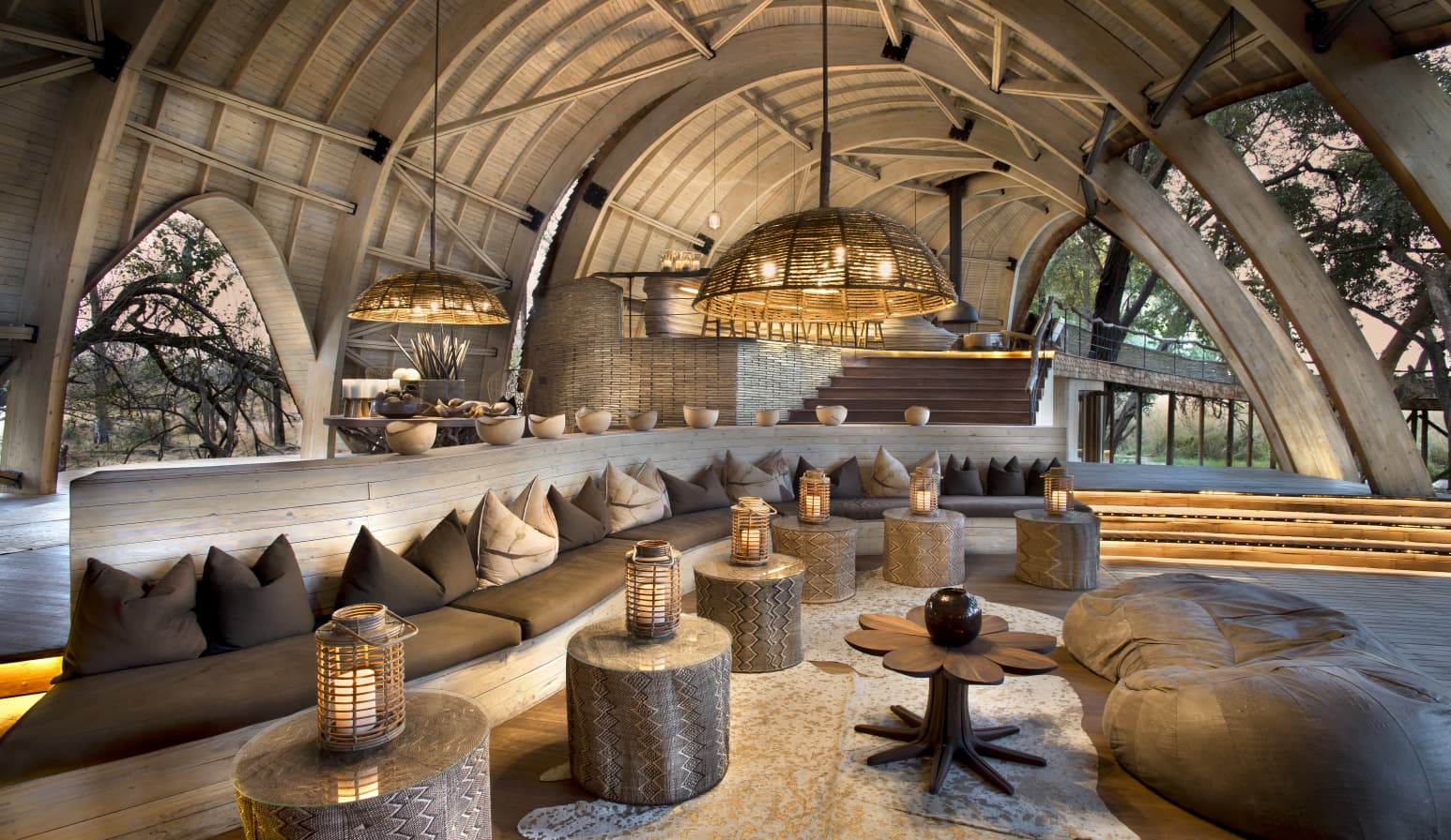 The Okavango Delta, known as the river that never finds the sea, lies at the heart of the Kalahari Desert. Here you will find the ultra-luxurious and architecturally stunning, Sandibe Okavango Safari Lodge. Situated on a private concession, Sandibe has exclusive traversing rights over 55,600 acres of wildlife land adjacent to the Moremi Game Reserve. Lion, cheetah, leopard and African wild dog share the floodplains with large herds of elephant and buffalo. Inspired by the shape of a rare native armadillo, the pangolin, the main lodge’s shingles and curved beams suggest its scales and ribs, as the 11,500 square foot building, open at both sides, both curls into itself and embraces the forest. One side is the restaurant and the other, up a half-flight of stairs, is an extraordinary bar contoured to wrap around into the lounge. Behind the lodge, golden grassed floodplains stretch into the distance, framed by lush palm islands and the spires of giant termite mounds. The beautiful organic architecture of the lodge blends seamlessly with one of Africa’s most breathtaking landscapes. Drawing its inspiration from nature, Sandibe is serene and earthy. Twelve