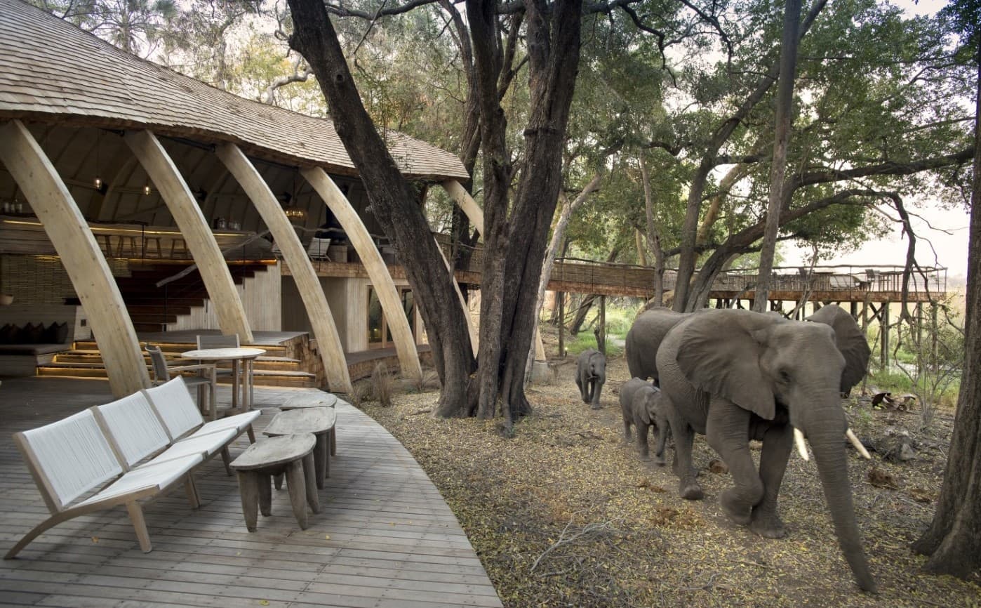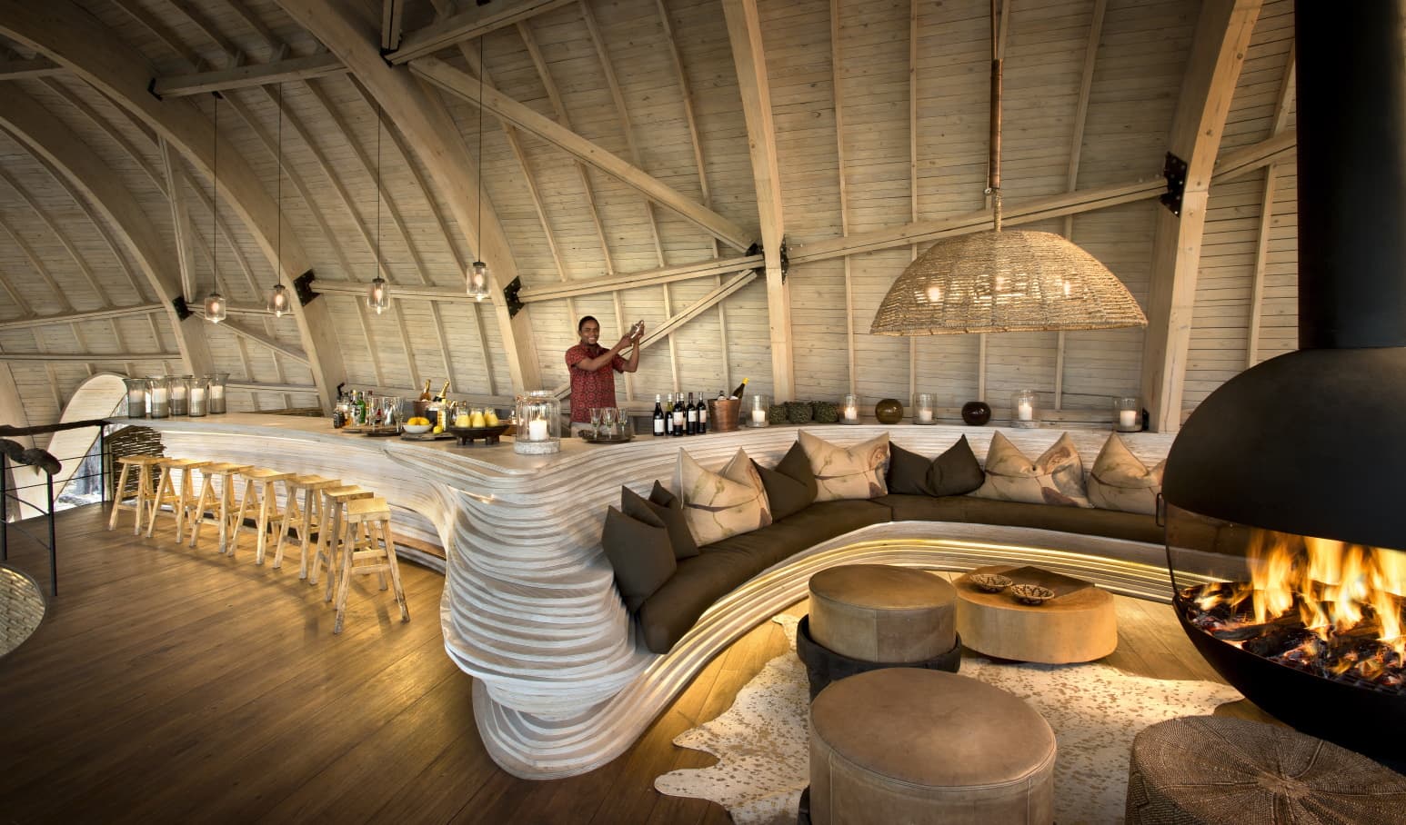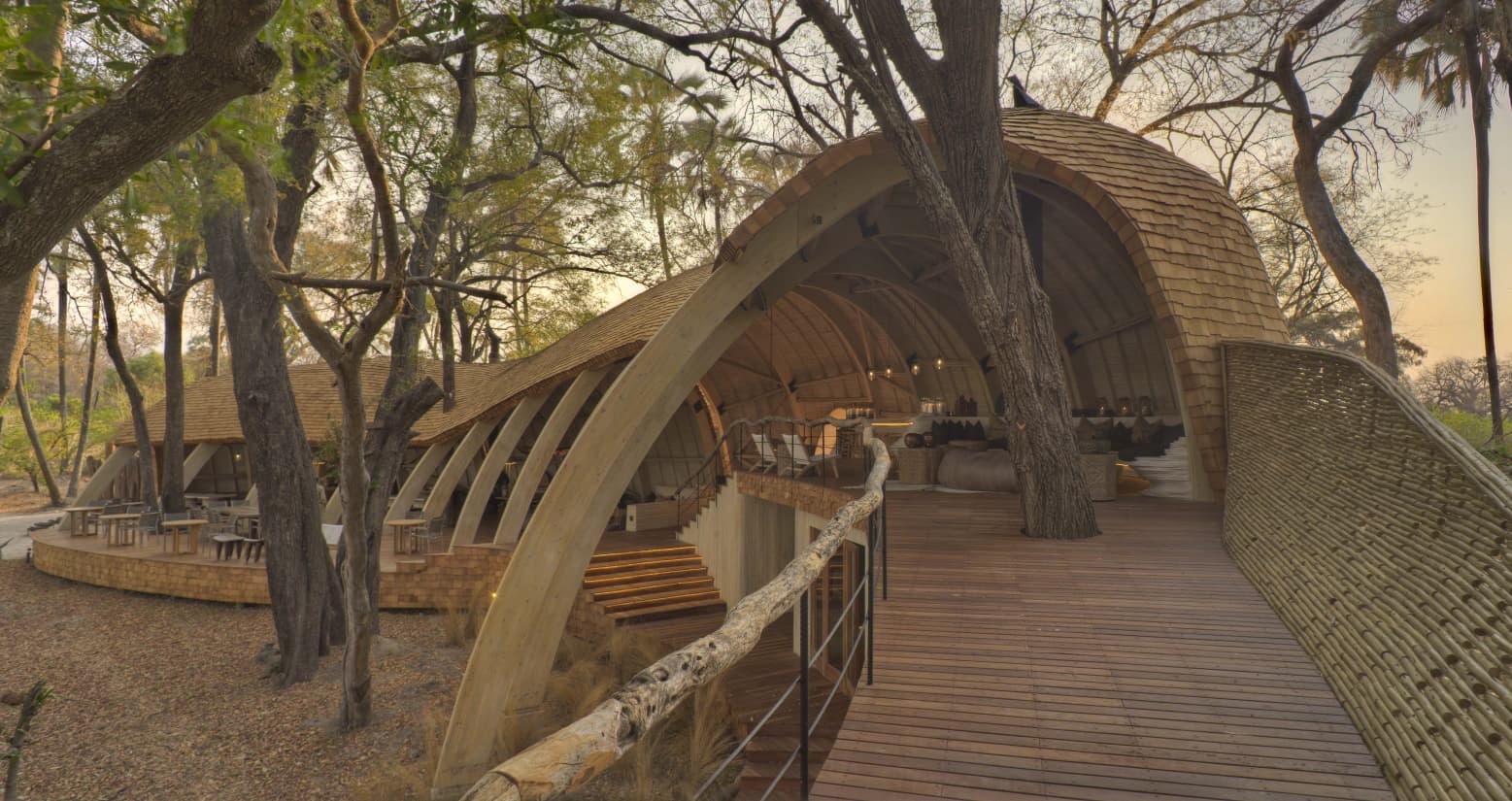 The Okavango Delta, known as the river that never finds the sea, lies at the heart of the Kalahari Desert. Here you will find the ultra-luxurious and architecturally stunning, Sandibe Okavango Safari Lodge. Situated on a private concession, Sandibe has exclusive traversing rights over 55,600 acres of wildlife land adjacent to the Moremi Game Reserve. Lion, cheetah, leopard and African wild dog share the floodplains with large herds of elephant and buffalo. Inspired by the shape of a rare native armadillo, the pangolin, the main lodge’s shingles and curved beams suggest its scales and ribs, as the 11,500 square foot building, open at both sides, both curls into itself and embraces the forest. One side is the restaurant and the other, up a half-flight of stairs, is an extraordinary bar contoured to wrap around into the lounge. Behind the lodge, golden grassed floodplains stretch into the distance, framed by lush palm islands and the spires of giant termite mounds. The beautiful organic architecture of the lodge blends seamlessly with one of Africa’s most breathtaking landscapes. Drawing its inspiration from nature, Sandibe is serene and earthy. Twelve