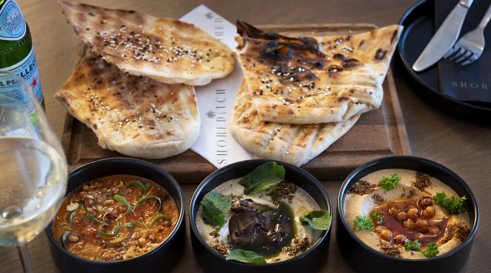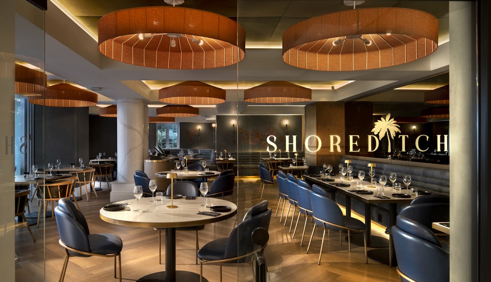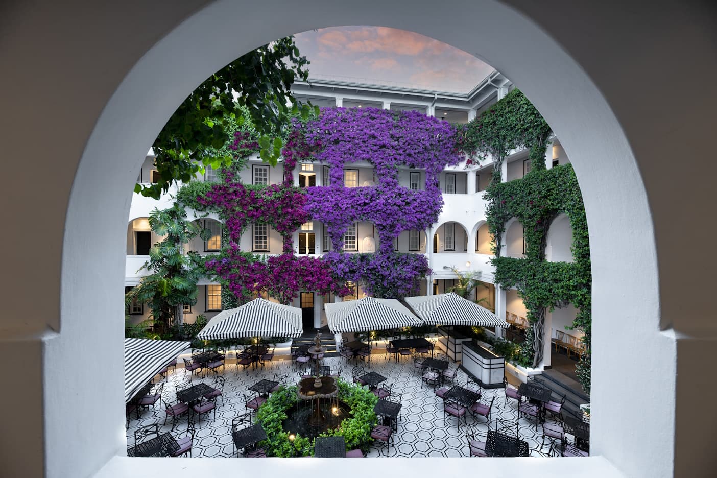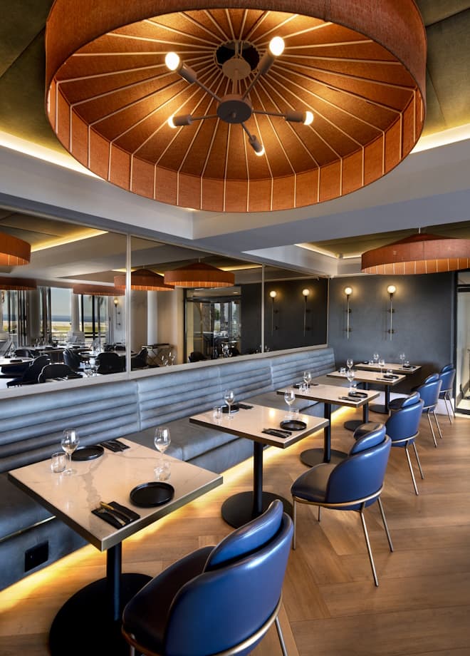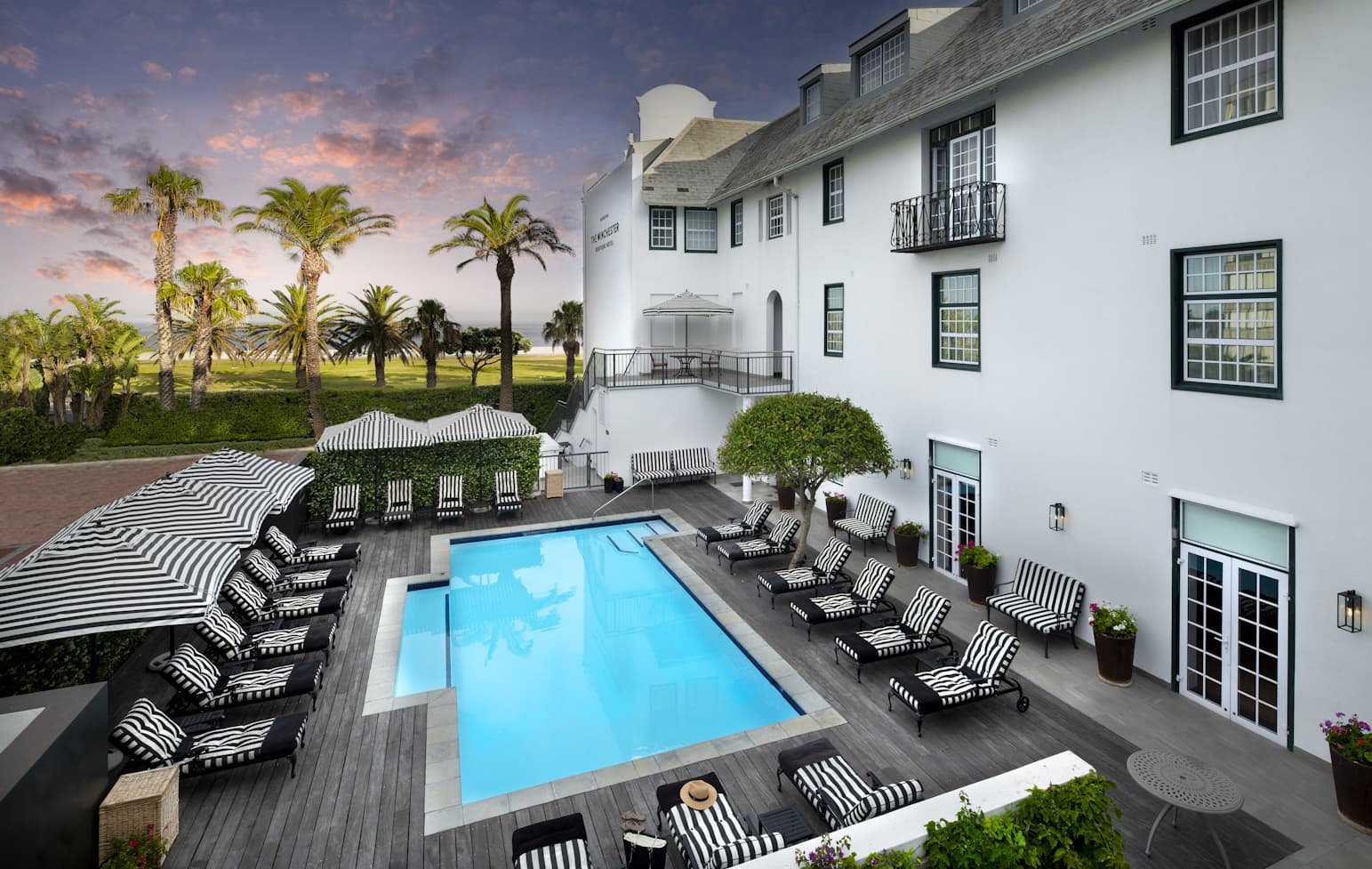 The refurbished Shoreditch Restaurant interior has petrol blue leather booths, charcoal-colored walls and oversized parasol-style lampshades in a vibrant coral hue. These pendant lights add an unexpected twist of color, cocooning each dining space as evening unfolds. French doors open onto the balcony overlooking the Atlantic Ocean where the coastal-colonial feel is reinforced by towering palm trees interspersing the tables. A beautiful marble bar opens from the restaurant onto the Winchester Hotel’s courtyard. This area, with its vivid magenta bougainvillea and monochrome patterned floor tiles, is one of Cape Town’s most Instagramable dining spaces.